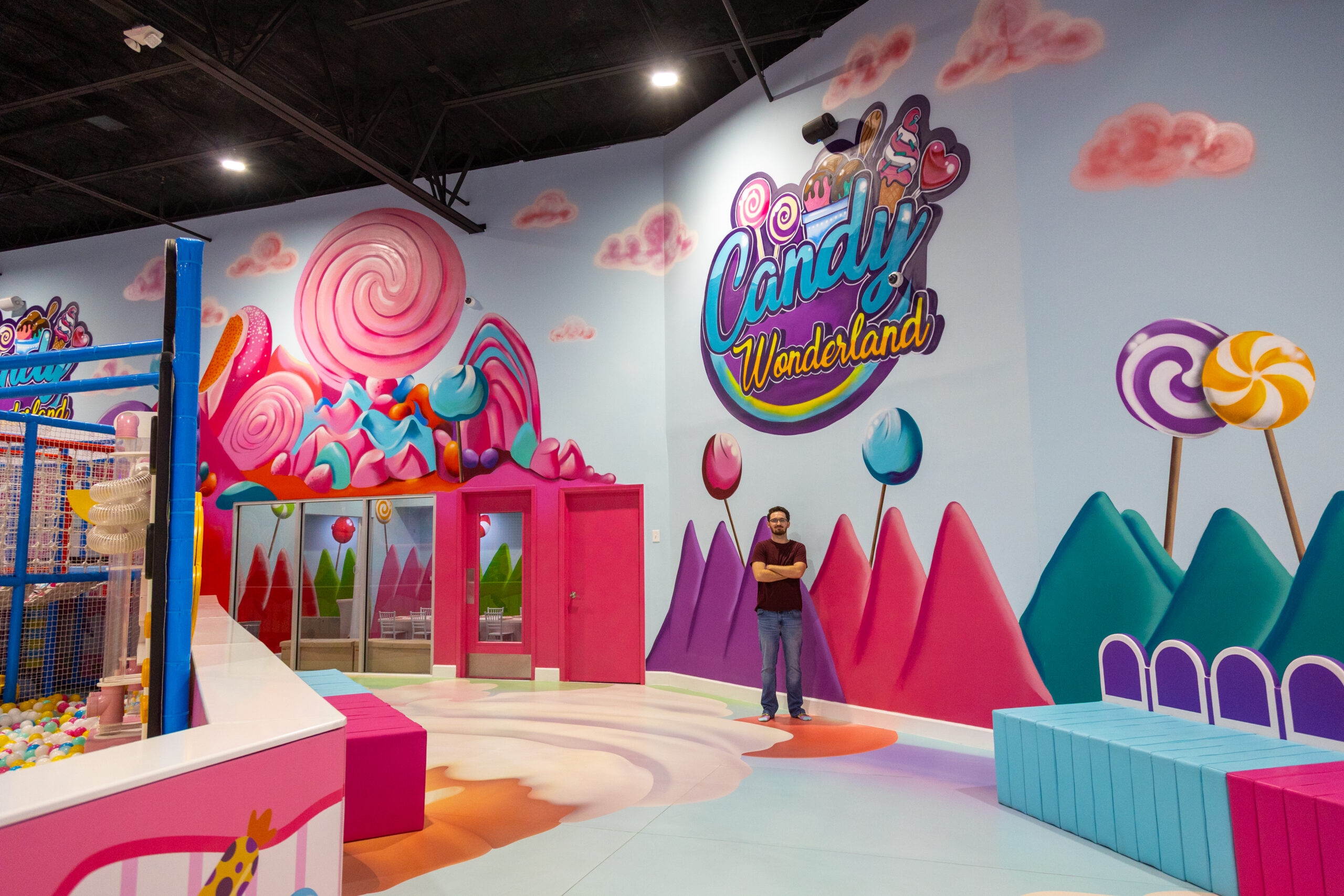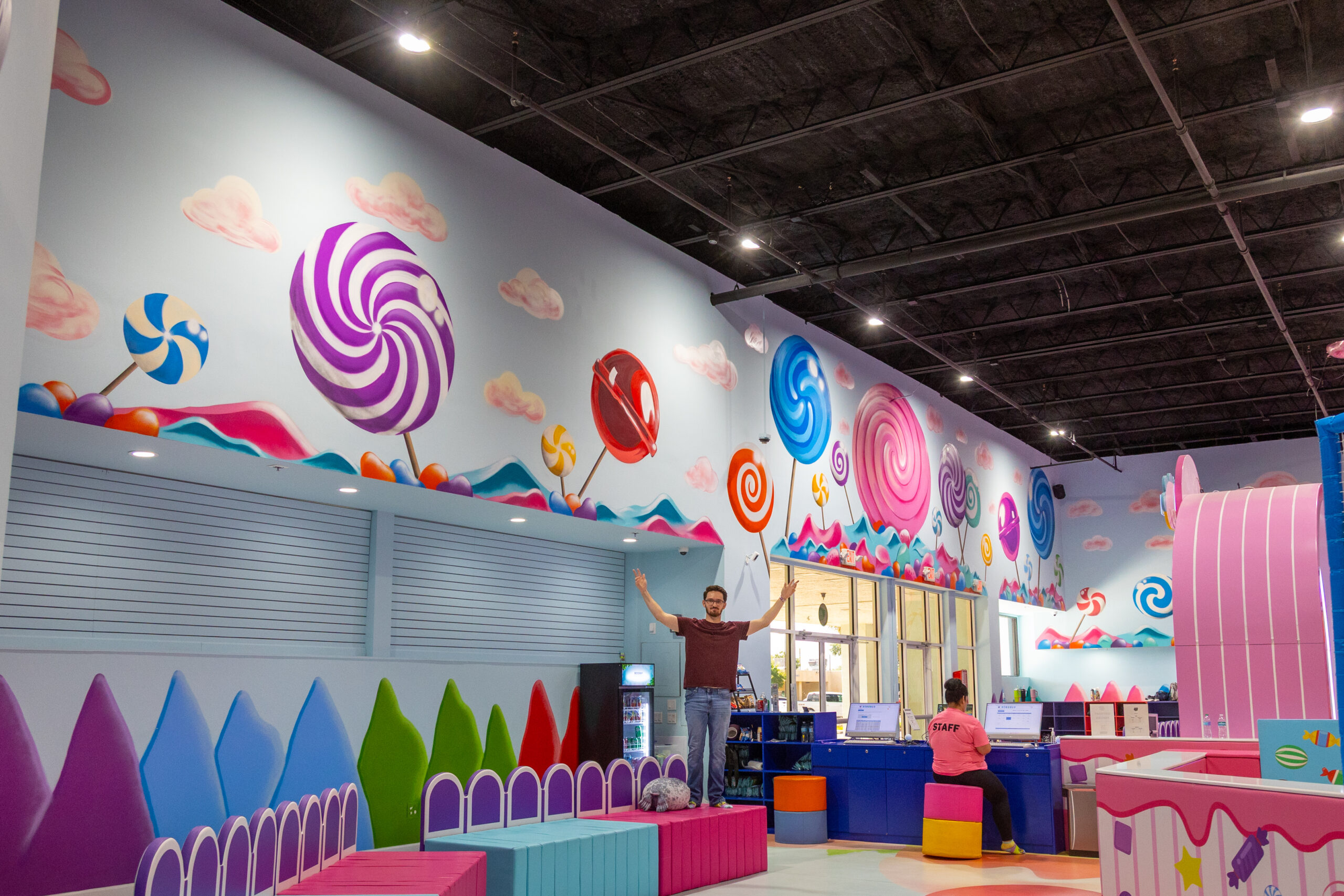 Candy Wonderland is more than a play space — it’s a vibrant, immersive experience. To bring the brand’s identity to life across multiple locations, mural artist Jesse was commissioned to design and paint a series of custom candy-themed murals that transform each space into a colorful wonderland.