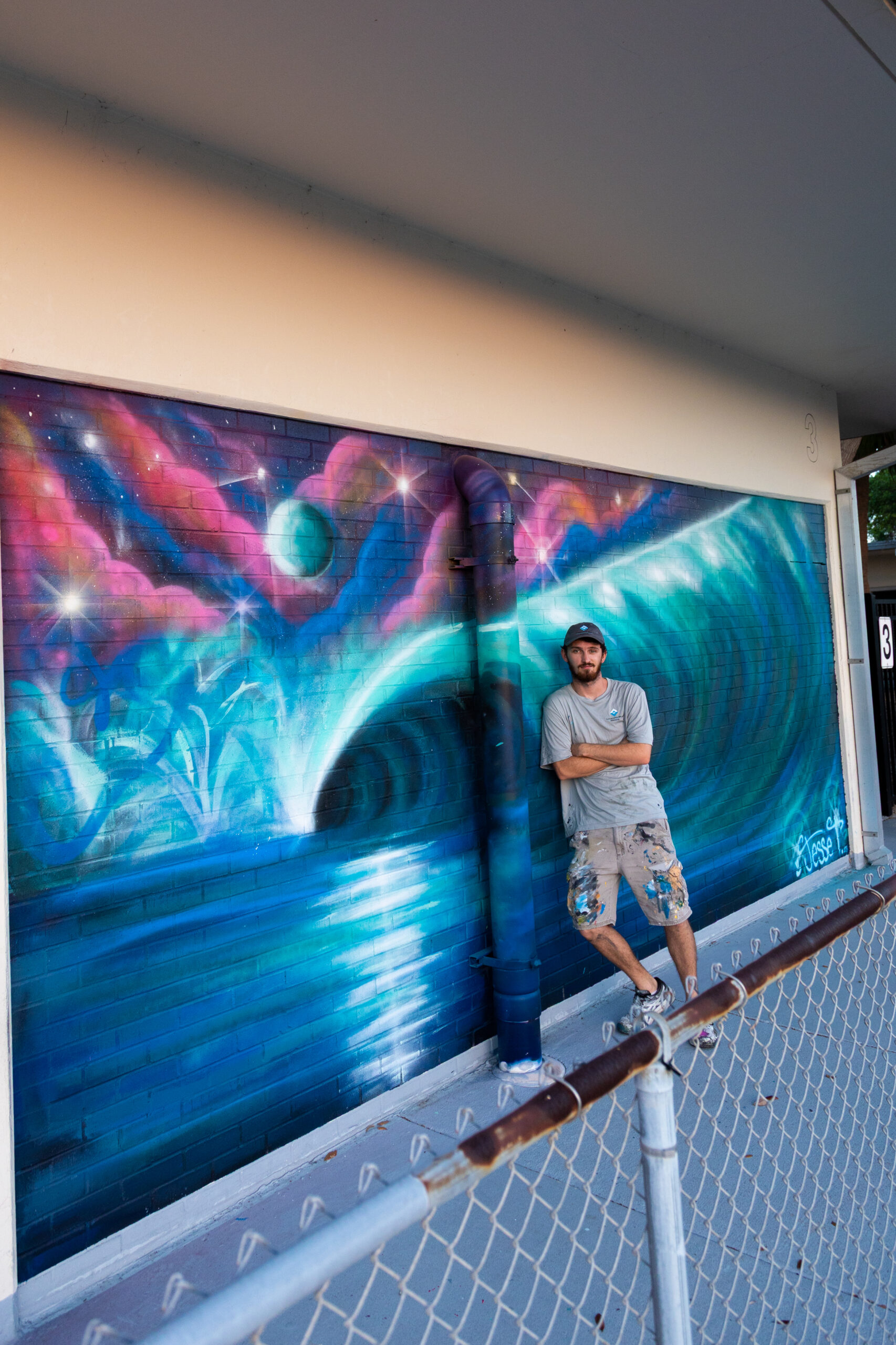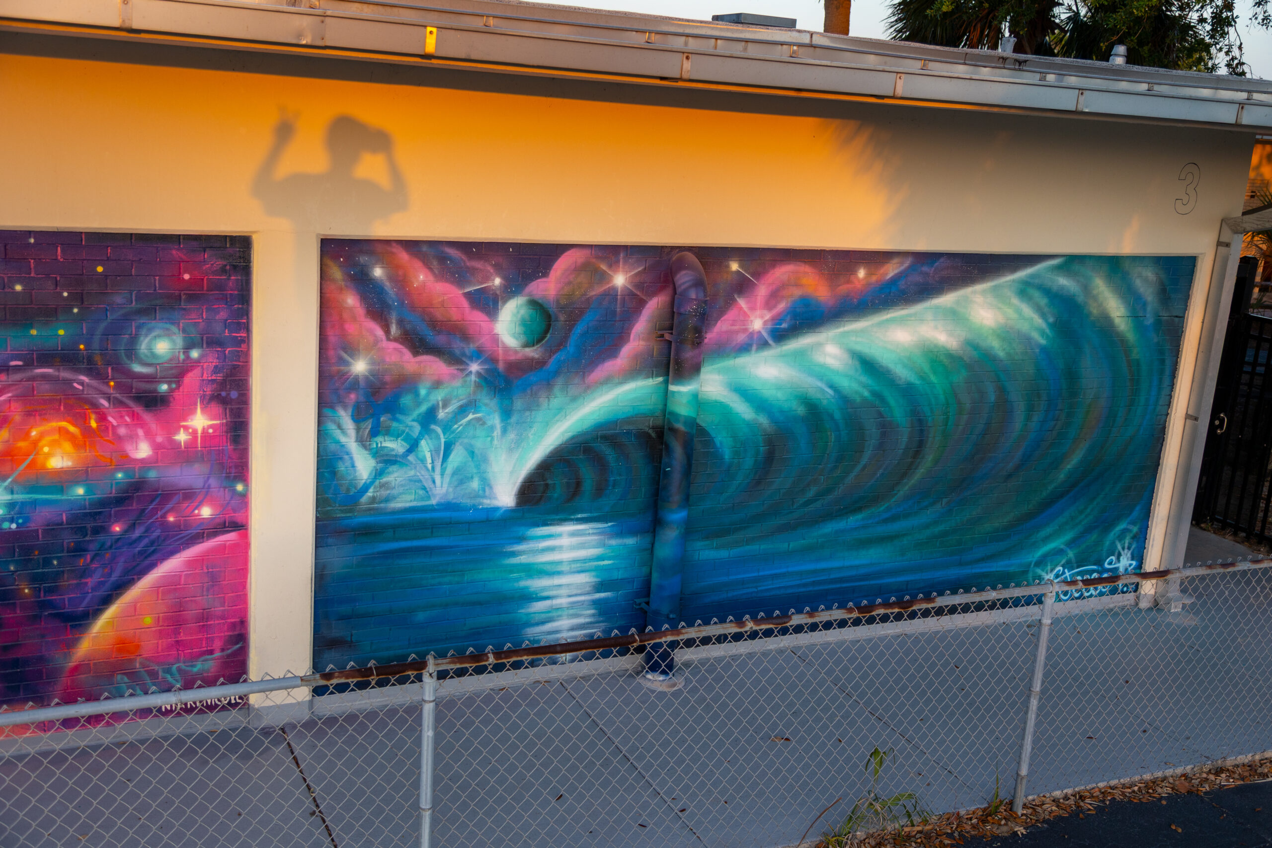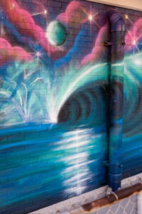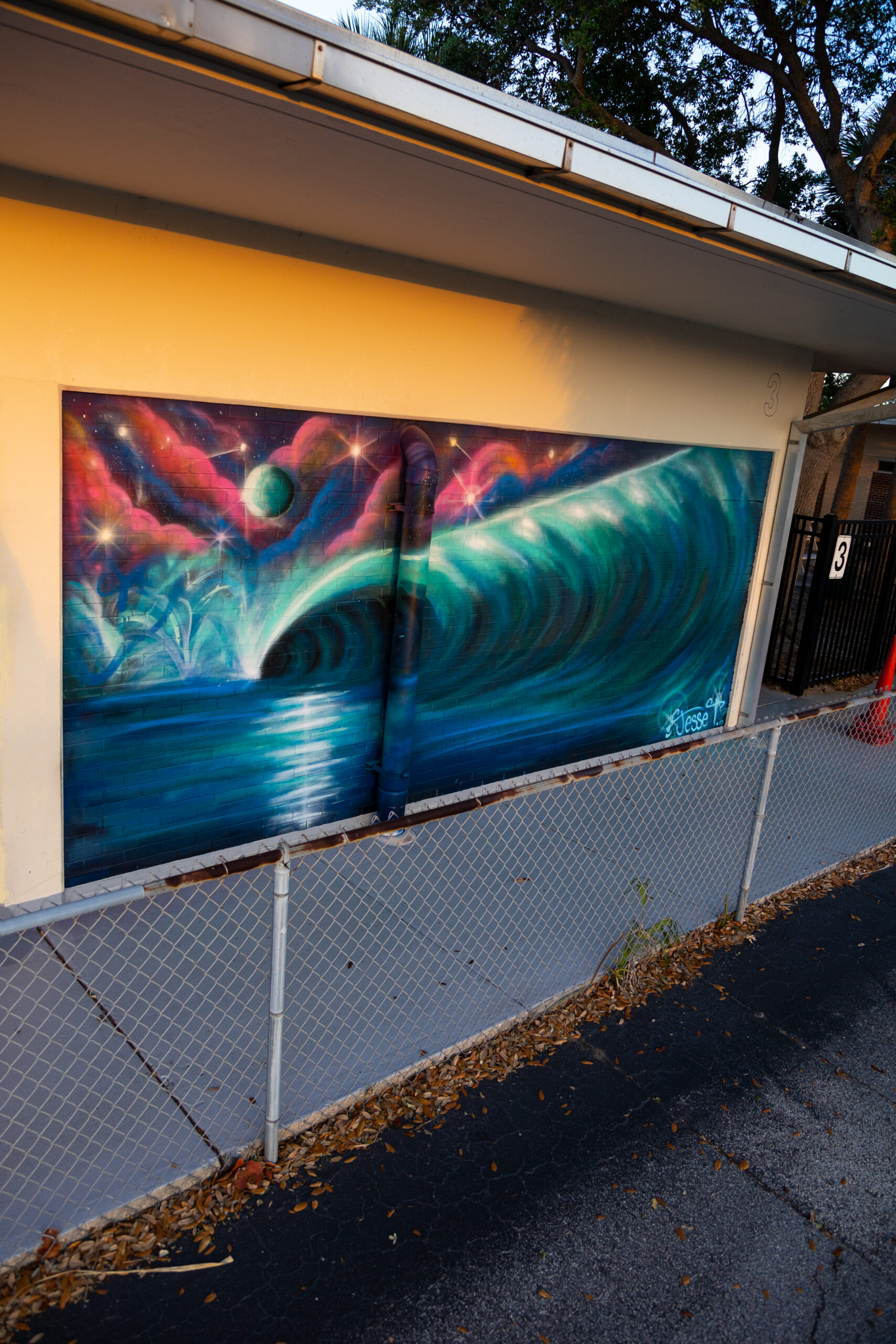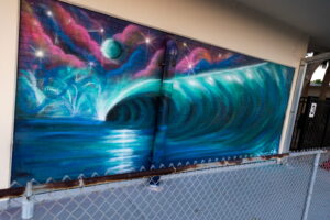 At Ocean Breeze Elementary, artist Jesse Travis transformed the school’s campus with a vibrant cosmic seascape mural. Blending the beauty of the ocean with the wonder of outer space, the design features a powerful turquoise wave rising beneath a glowing sky filled with planets, stars, and colorful clouds.