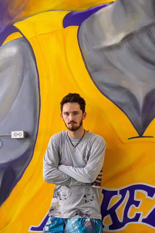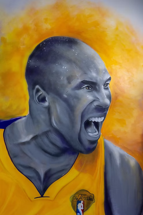 Set against a backdrop of explosive purple and gold energy, Jesse’s tribute to the “Black Mamba” captures Kobe’s signature intensity and passion. The lifelike portrait — featuring his iconic #24 Lakers jersey — radiates determination, focus, and the championship spirit that defined Bryant’s legacy.