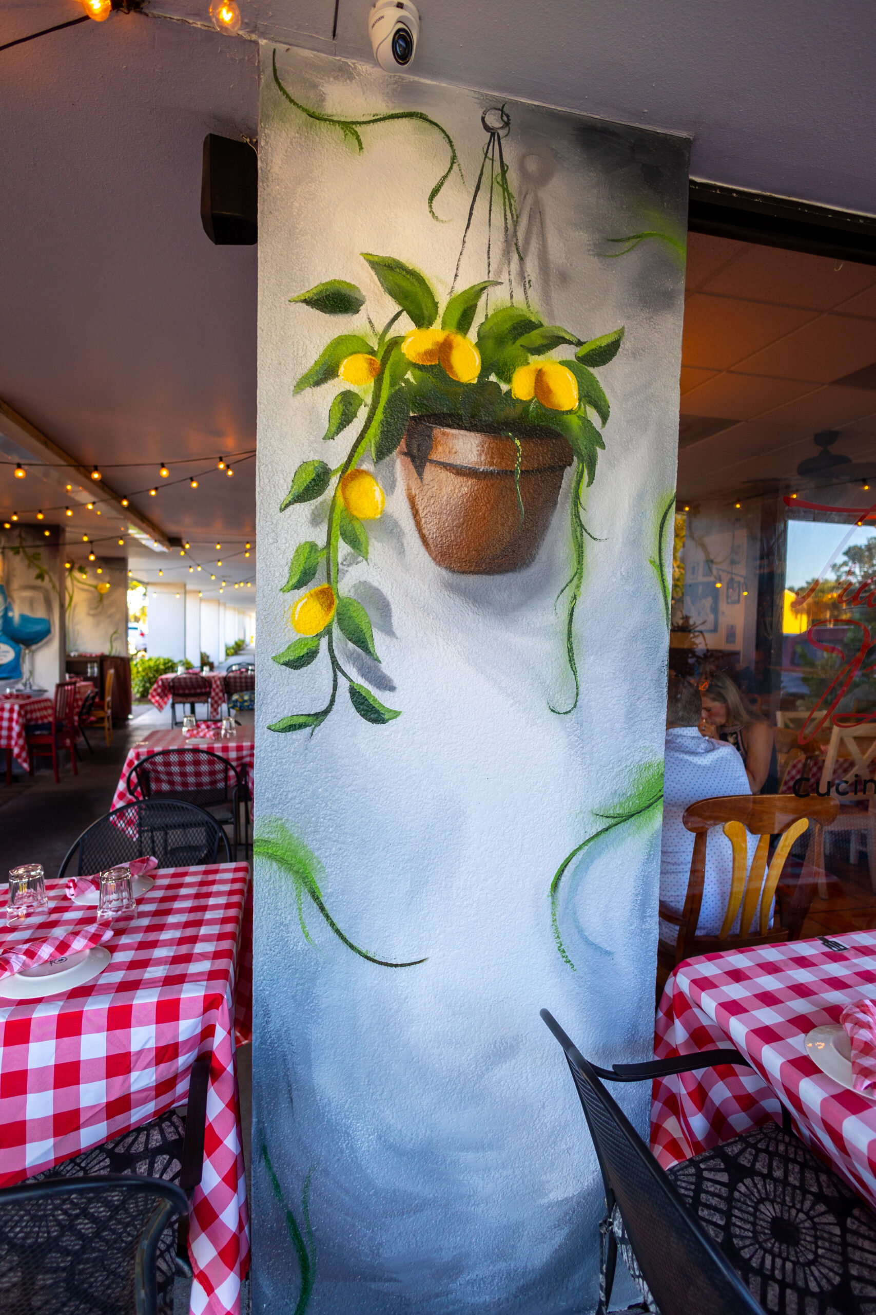 Jesse’s murals are inspired by the beauty of the Mediterranean. Guests dining at Trattoria Bella enjoy: