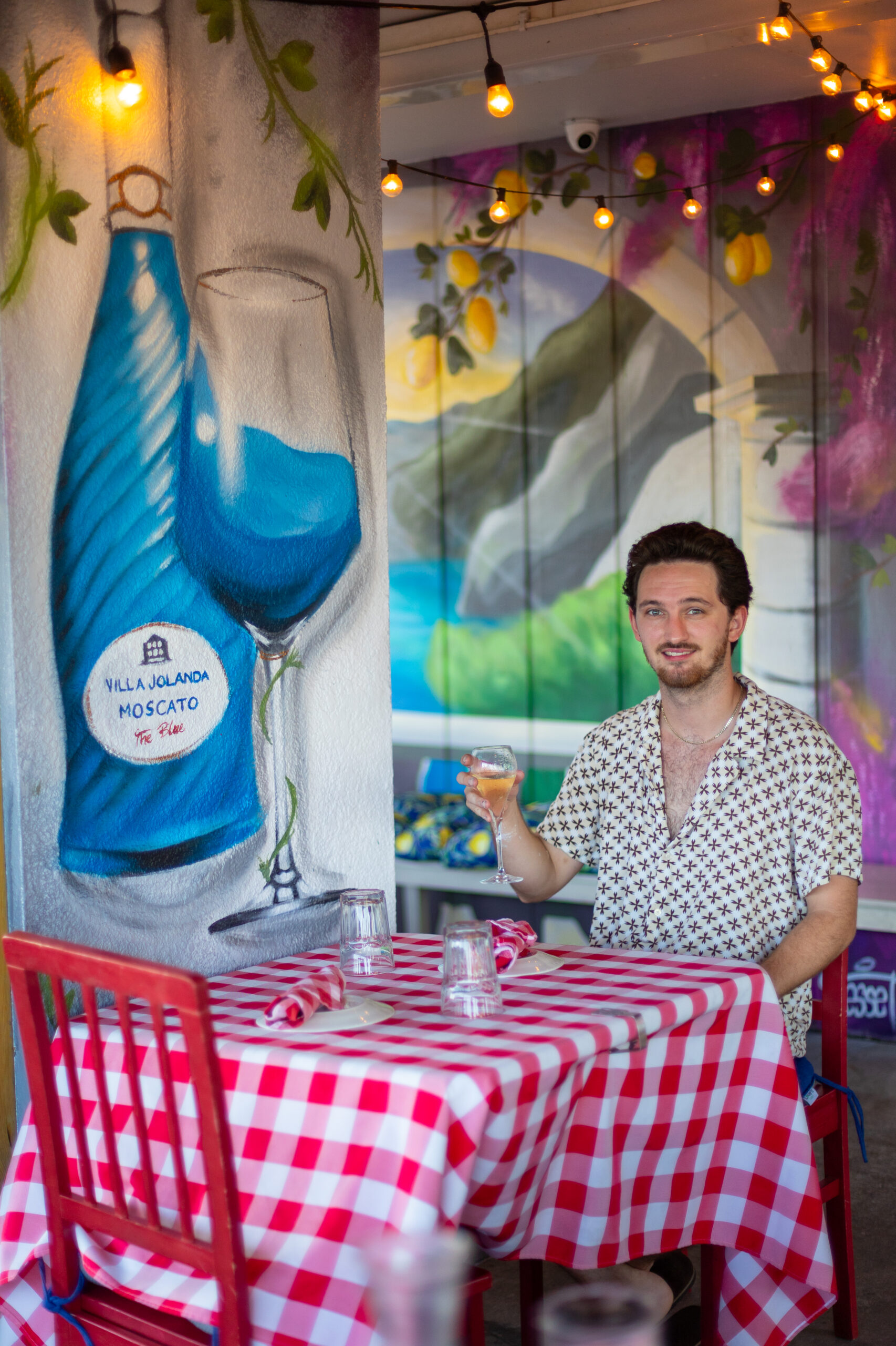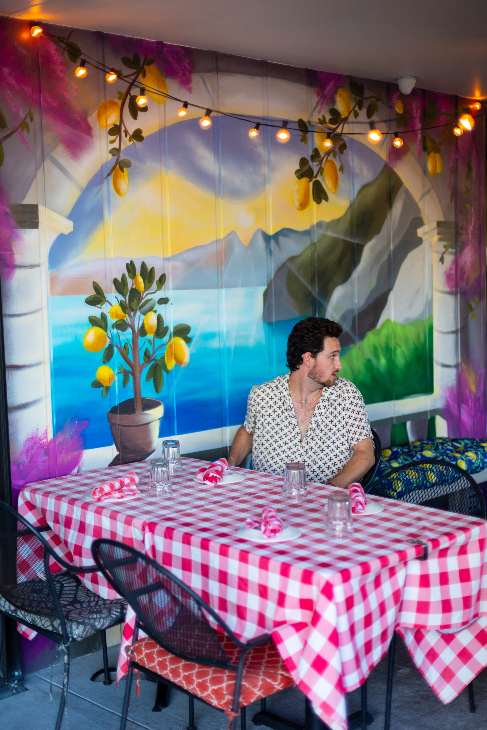 The restaurant’s red-and-white checkered tables, string lights, and Jesse’s immersive artwork combine to create an unforgettable setting for authentic Italian meals. From lasagna to vegan-friendly plates, every dish is enjoyed against a backdrop of vibrant, hand-painted artistry.