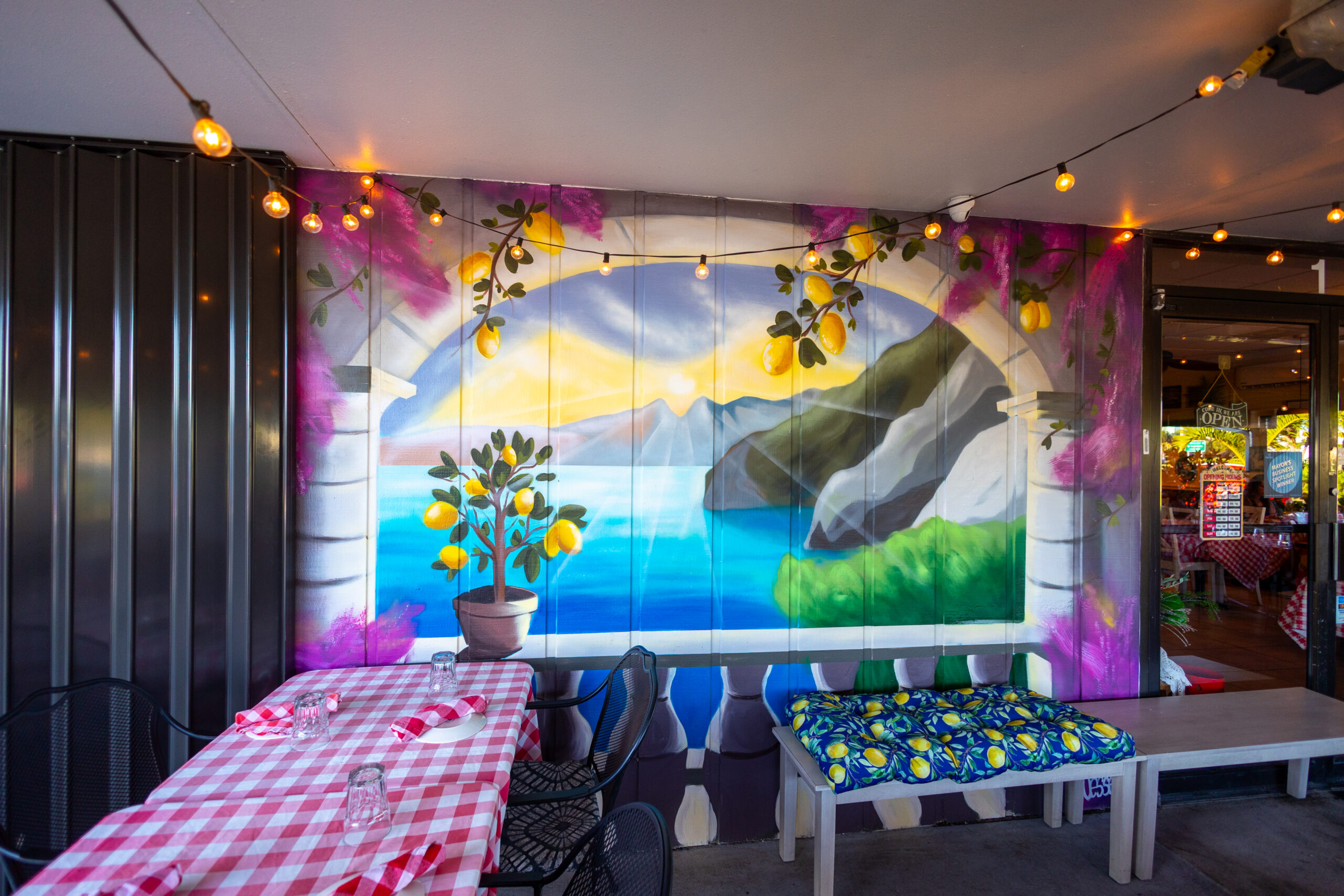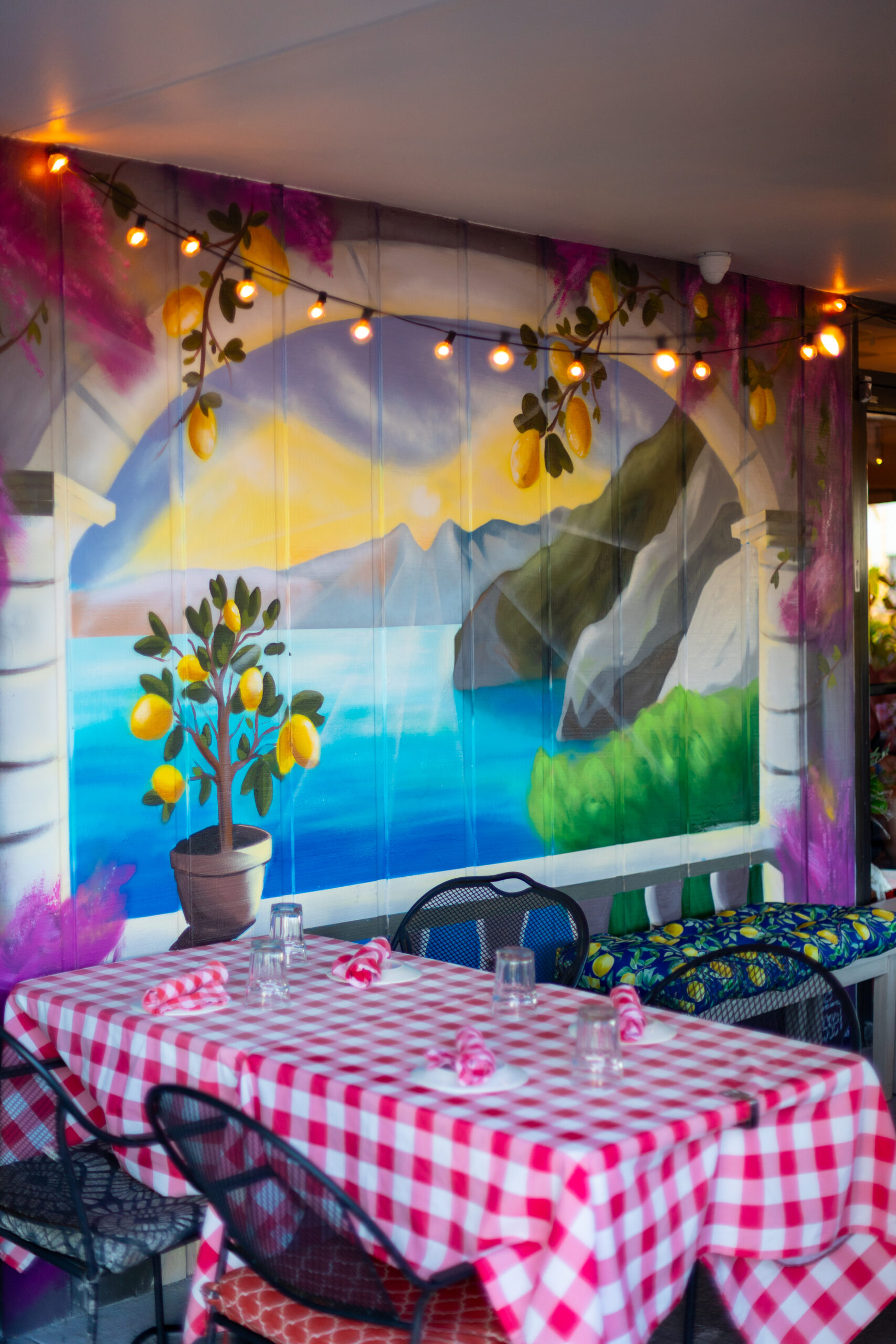 - A breathtaking Amalfi Coast mural, giving diners the feeling of looking out over the sea from a sunny terrace in southern Italy.