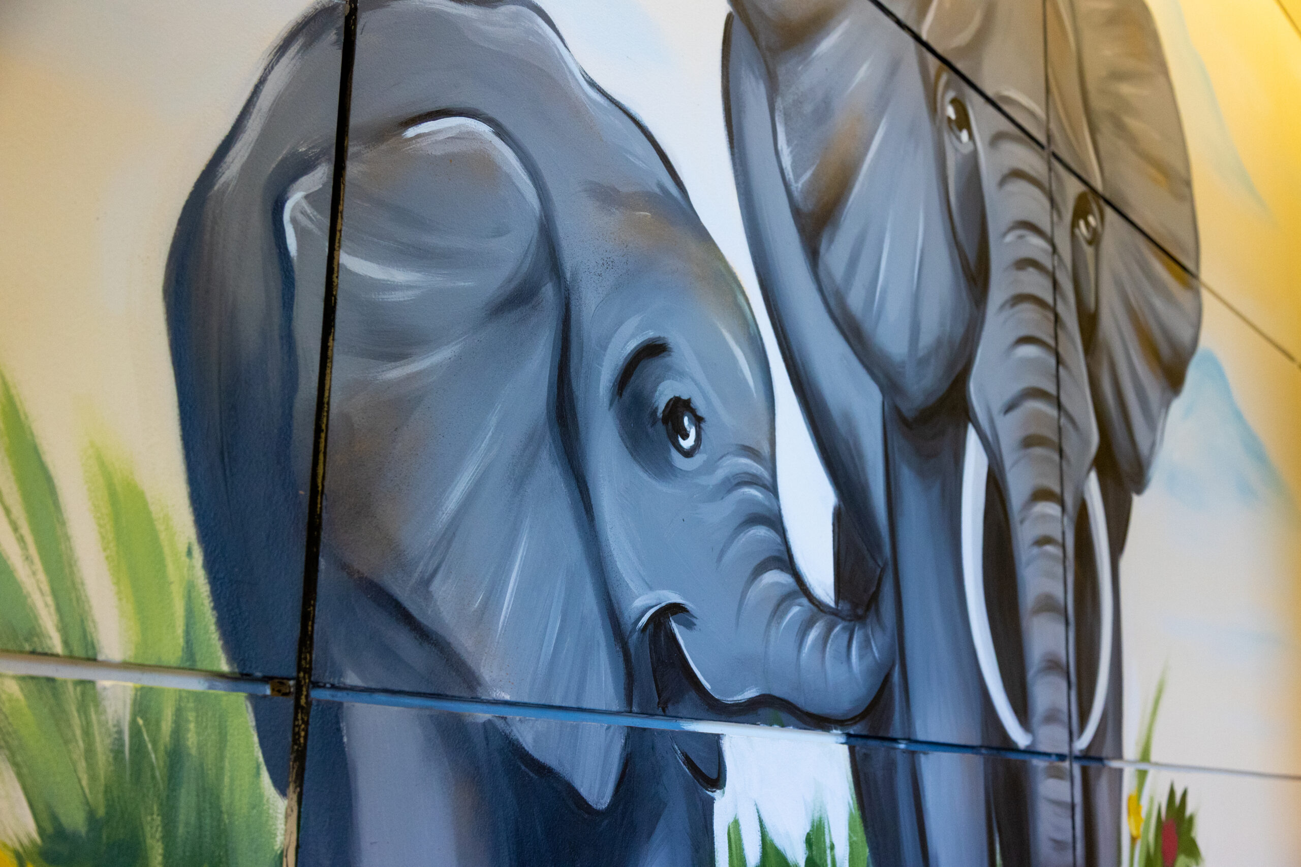 At the Harry T. & Harriette V. Moore Justice Center in Viera, Florida, artist Jesse Travis brought warmth and imagination to the courthouse with a series of community-driven murals. Designed to create a welcoming environment for children and families, the artwork features gentle, larger-than-life wildlife scenes — including a curious giraffe peeking through lush greenery and a pair of elephants rendered in soft, expressive detail.